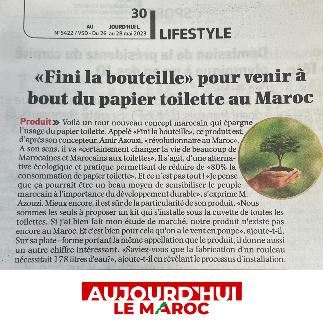 «Voilà un tout nouveau concept marocain qui épargne l'usage du papier toilette. Appelé "Fini la Bouteille", ce produit est d'après son concepteur, Amir Azouzi "révolutionnaire au Maroc"»