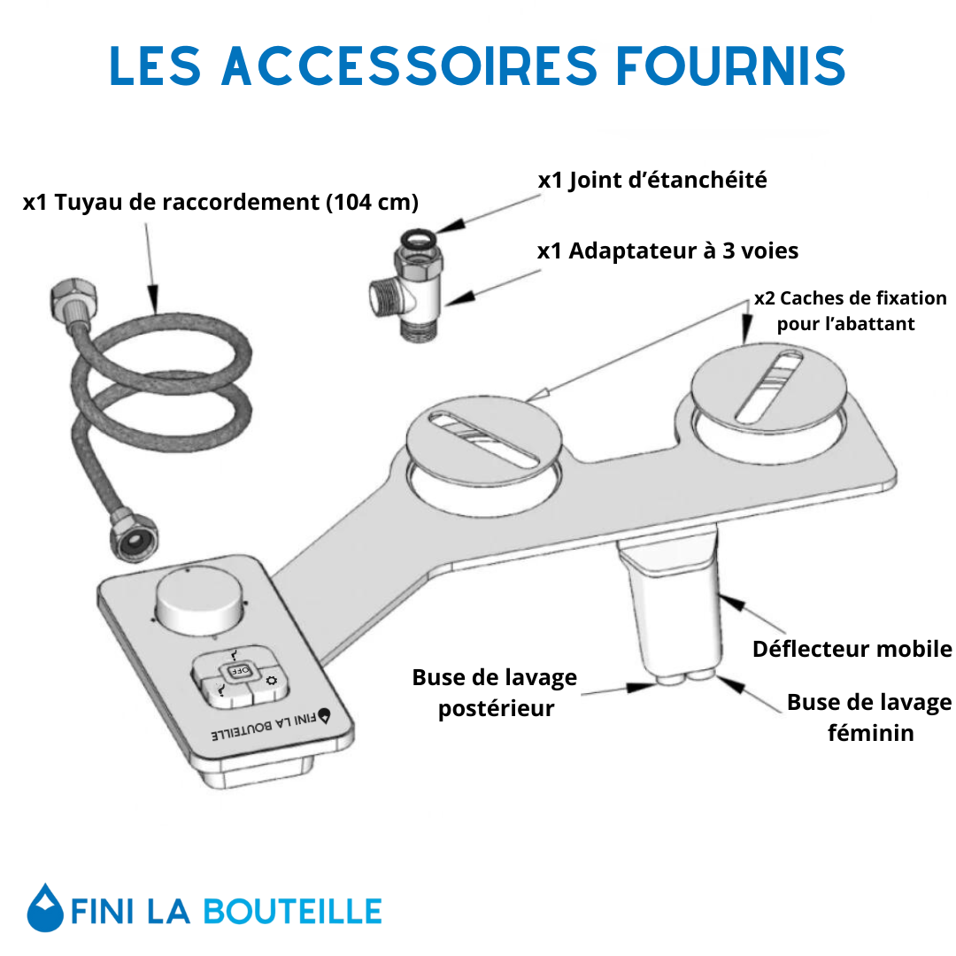 Notre bidet fonctionne sans électricité ni pile ! Il s'installe facilement sous la cuvette de tes toilettes et se raccorde à ton arrivée d'eau en 10 min. Tous les accessoires requis pour l'installation sont fournis !